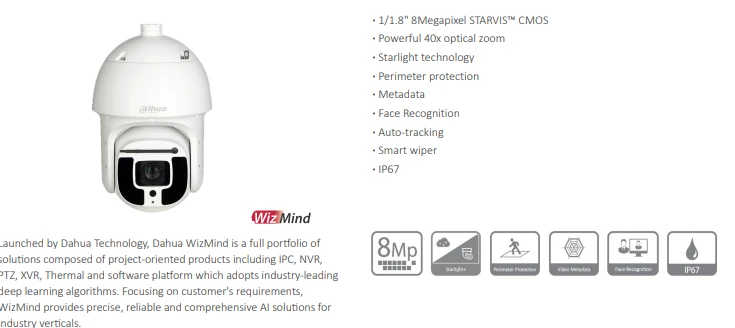 CAMARA DAHUA PTZ IP 8MPX 40x H265 IR500m WIZMIND STARLIGHT HI-POE IP67 C/WIPER DH-SD8A840N-HNF-PA
